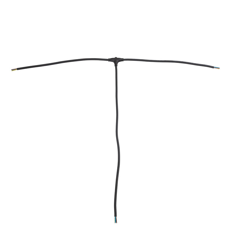 Cavo di alimentazione in gomma flessibile a T 3G2.5 (14 AWG) progettato per distribuire un ingresso di alimentazione a due uscite, senza connettori (connettori a scelta). Lunghezza: 2 x 50 cm + 1 x 80 cm.