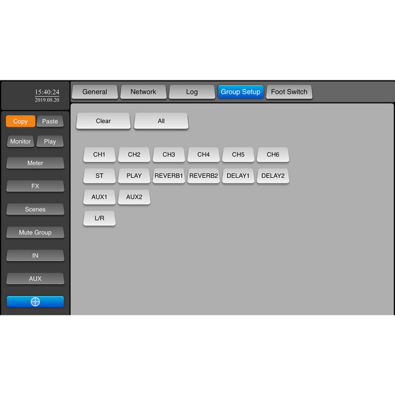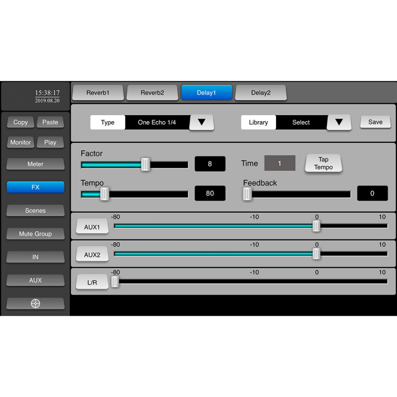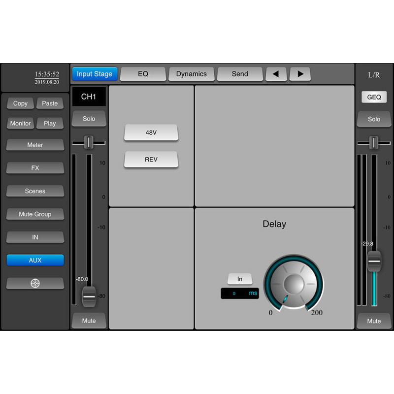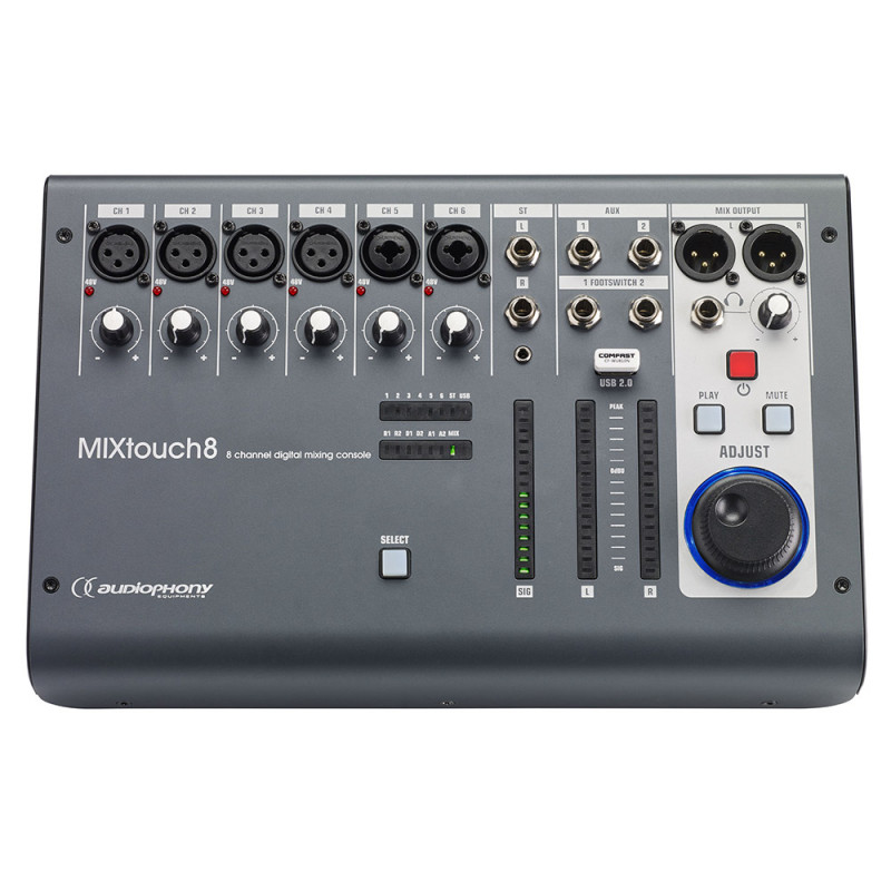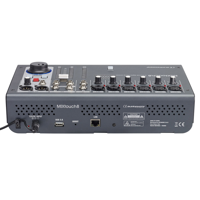 Console de mixage à 8 canaux, équipée de 6 entrées microphone (4 XLR et 2 Combo XLR/Jack), 1 entrée ligne (2 Jack 6.35 mm et mini Jack 3.5 mm), 1 sortie master (2 XLR) et 2 sorties AUX (Jack 6.5). Pour utiliser cette console, il suffit de la connecter à votre PC via le port LAN situé sur l’arrière de l’appareil et d’installer le logiciel inclus. Un dongle WiFi qui se branche sur le port USB est également inclus pour connecter la console sur un réseau sans fil. Le logiciel vous permet de nommer et d'attribuer une couleur pour chaque canal, mais aussi d’ajouter et modifier des effets numériques comme delay ou écho, de contrôler le réglage du gate et du compresseur et l'égaliseur graphique. Le port USB vous permettra d’enregistrer votre mix ou lire des fichiers audio WAV/MP3.