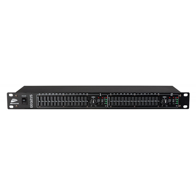 15-band analog stereo graphic equalizer per channel, ±12 dB adjustment, bypass switch and 50 Hz high-pass filter (LOW CUT), gain adjustment for each individual channel, 4-LED output level indicator.