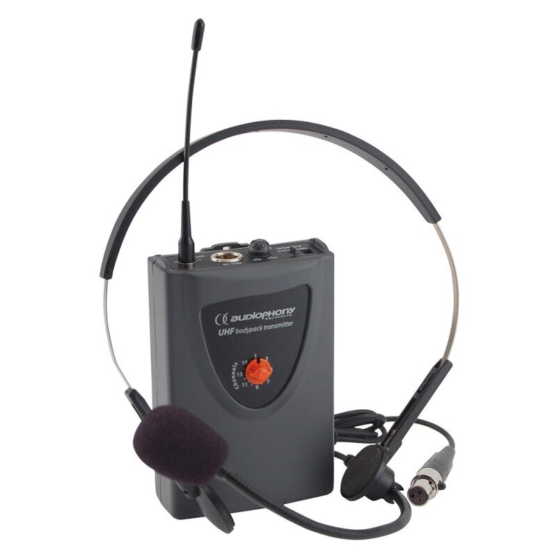- Unidirectional headworn condenser microphone + UHF transmitter with adjustable volume