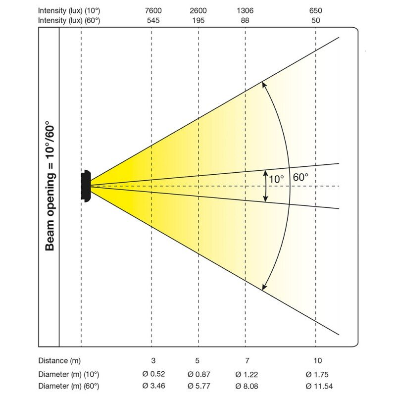 12 LED Osram 4 couleurs de 10 W avec un rendu chromatique incroyable. Rotation Pan de 540° et Tilt de 270°. Mémoire de position avec repositionnement automatique. Zoom linéaire de 10° à 60° avec lentilles de zoom et mise au point HD. Vitesse du ventilateur réglable. Mode de contrôle DMX de 1 à 17 canaux. Modes autonome, maître/esclave et son.